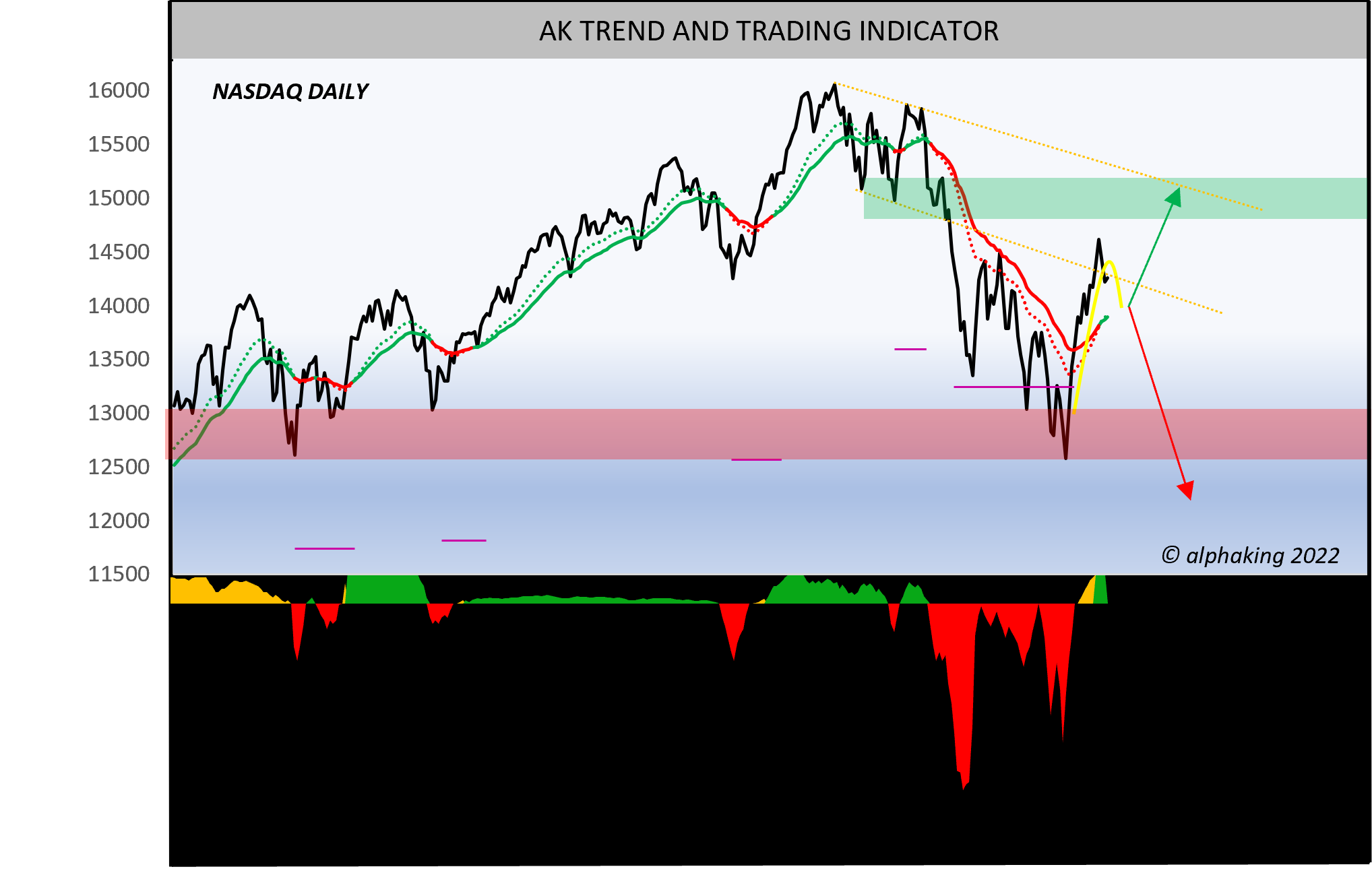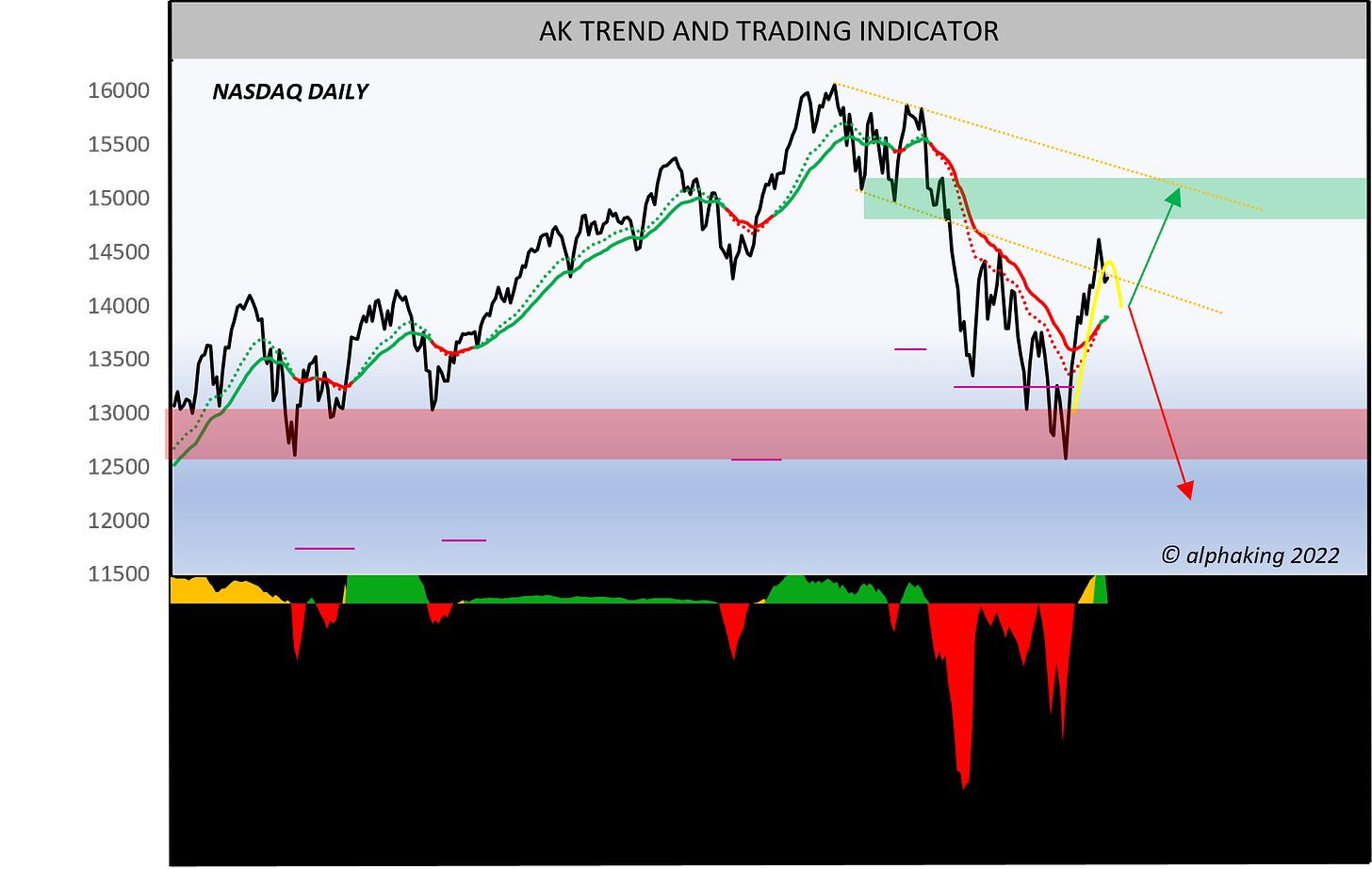 The third chart shows the NASDAQ continuing to follow our yellow line projection above our trend averages, and currently undertaking the pullback to retest those trend averages I warned was coming. The green band remains the eventual target where the bear market likely dies and reverses. The bulls need to smash through that resistance zone to end the bear potential, something which will be extremely difficult for the bulls to pull-off. Since the trend remains up, we will continue to hold our QQQ positions, although hedged to limit any reversal pain, which unfortunately I fear will eventually come. Remember, we trade trends here at AK - adjusting exposure based on risk - rather than anyone’s opinion. The stock indexes rocketing to new highs remains a possibility, and we are on the lookout for signs the bulls are winning this bull/bear war. So far, the bulls are failing in that regard, but that can change, and the up stance of our trend indicators says to give them a chance.