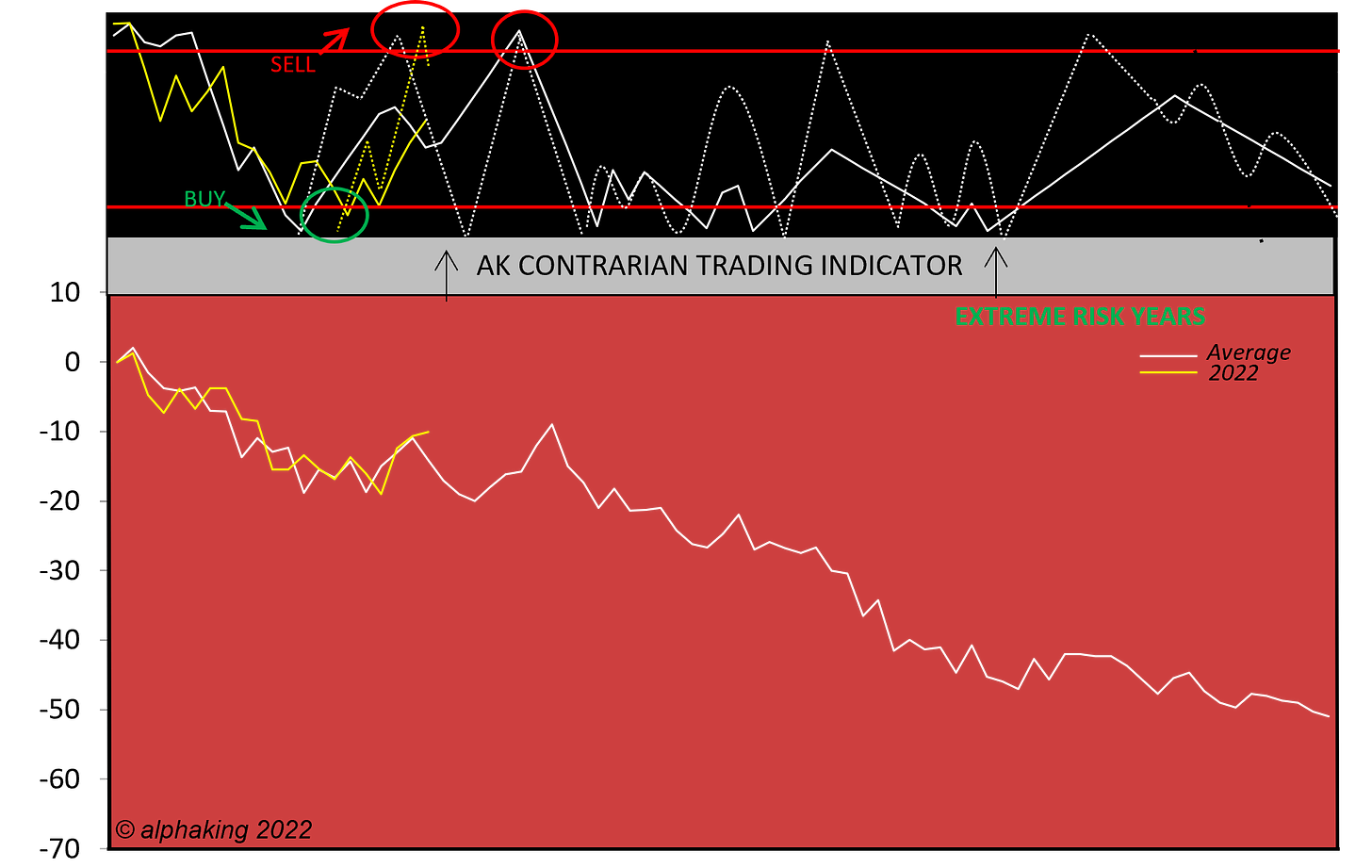 The first chart below shows the expected progress of the NASDAQ in extreme-risk bear phases, which is the part of the cycle we believe we are currently in. The yellow lines of the current NAZ and those of the contrarian trading indicators on top appear to be tracking expectations, with the dotted yellow faster moving contrarian line near the top of the chart closing above, then below, the overbought sell zone this week. That was our cue to take profit on our TQQQ hedge, which we replaced with UVXY. We continue to look for a favorable reversal point to flip our TNA hedge for TZA, although the small caps appear in good shape, so holding TNA remains called for.