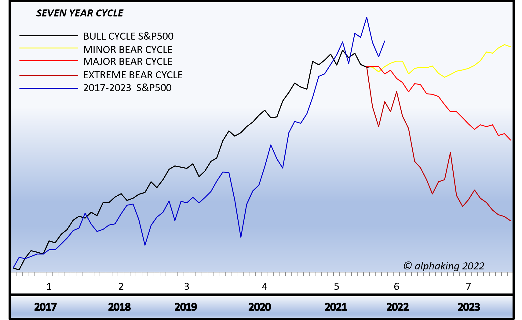 The next chart shows the seven-year cycle we have tracked since 2016 when the last bull phase began. This chart suggests a new bear market is underway. If so, while April likely sees mildly higher prices for a week or two, the eventual low for April should see the S&P500 close on a new low for this bear phase, which should run into late 2023.